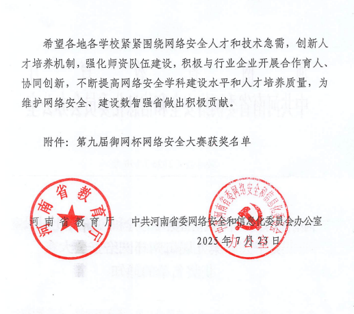 (来源:高校信息网)近日,河南省教育厅、中共河南省委网络安全和信息化委员会办公室联合发布第九届“御网杯”网络安全大赛获奖名单通知,我校共斩获一等奖1项、二等奖2项、三等奖7项。