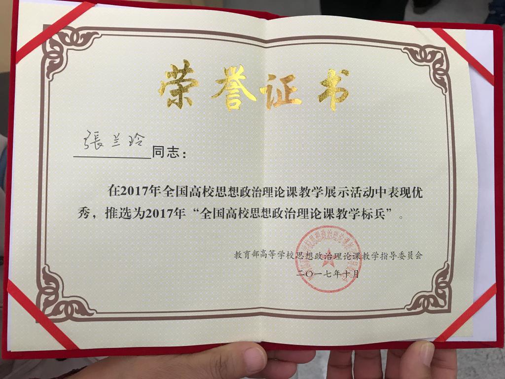 此次活动得到了校领导的大力支持,在思想政治理论教研部和学校相关部门的合力协助下,张兰玲教授顺利完成授课录像的录制工作,参与了2017全国高校思政理论课教学展示活动的网络展示,成功入选了教学现场展示活动。在现场展示环节,张兰玲教授精心准备、完美发挥,在全国50余名参赛教师中脱颖而出,获得了教学展示一等奖,被评为2017“全国高校思想政治理论课教学标兵”。