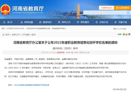 2月12日,《河南省教育厅办公室关于公布2022年度职业教育信息化标杆学校名单的通知》公布了河南省教育信息化标杆学校,共评选出39所职业教育信息化标杆学校,其中高职院校28所,我校成功入选。