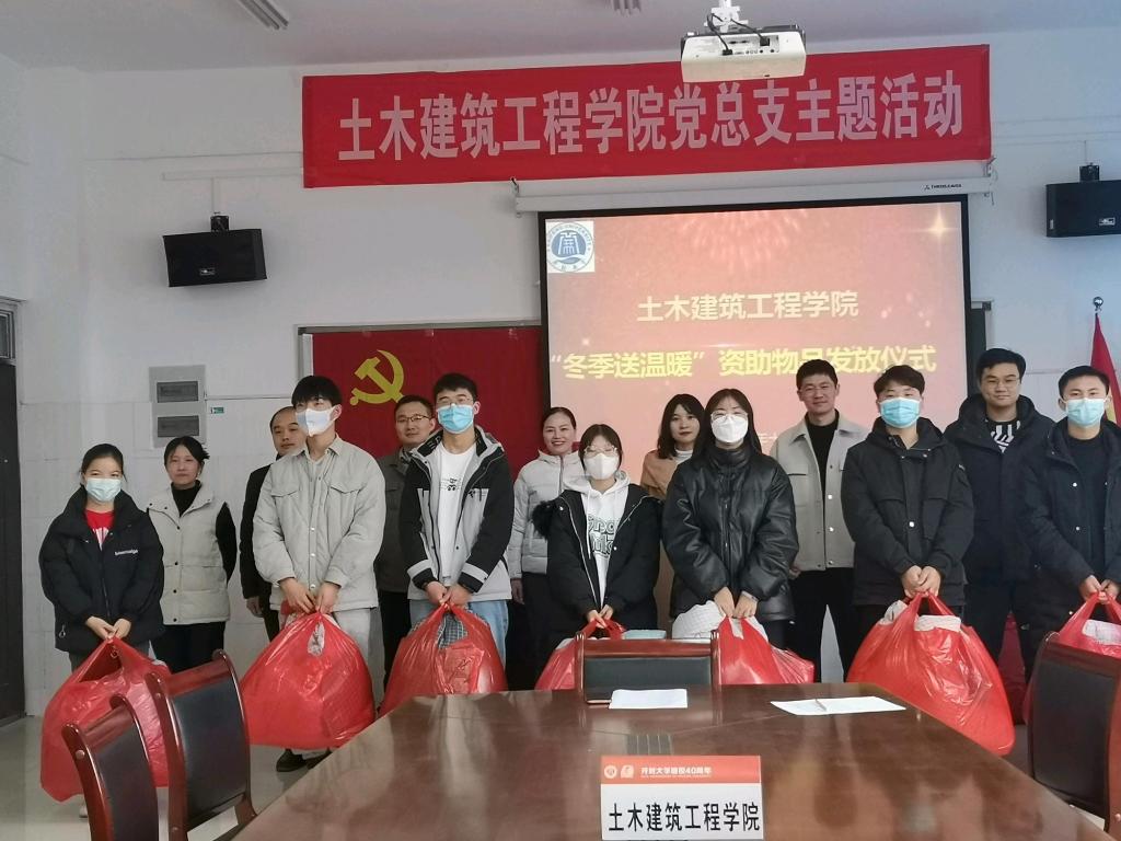 为贯彻落实国家资助政策,保障家庭困难学生在高等教育阶段“三不愁”,即入学前不用愁、入学时不用愁、入学后不用愁,12月8日,在土木建筑工程学院8号楼503会议室举行了“冬季送温暖”资助物品发放仪式。出席本次活动的有学院党总支书记李春霞、副书记武志远、副院长李军、团总支书记赵文婷及全体辅导员和受助学生,该活动由王士军老师主持。