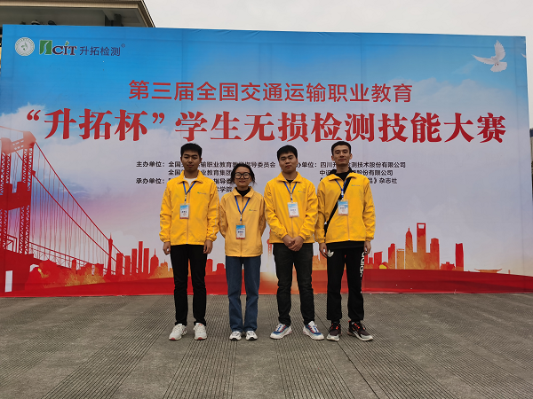 近日,第三届全国交通运输职业教育“升拓杯”学生无损检测技能大赛在四川省成都市落下帷幕,经过几天激烈角逐,我校土木建筑工程学院李君和王朝锋老师指导的学生郑笑燃、杨涛、韩琬琼、项春豪获得单项二等奖一项、单项三等奖两项、团体三等奖一项的优异成绩。
