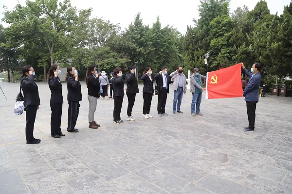 全体党员庄严肃立,向焦裕禄烈士陵墓三鞠躬;现场在党旗下重温入党誓词;绕陵墓一周行注目礼。