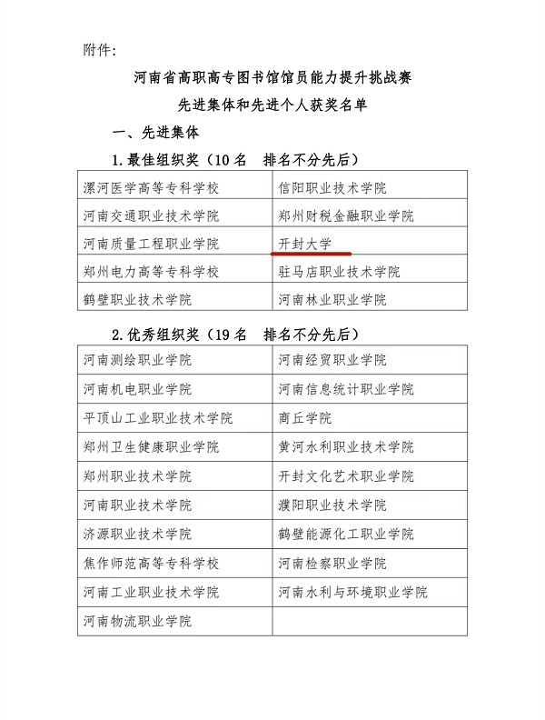 5月23日,河南省高等学校图书情报工作委员会表彰了高职高专图书馆馆员能力提升挑战赛中获得先进的集体和个人,我校图书馆获得最佳组织奖,二十位馆员获得个人奖项。
