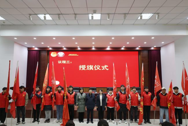 仪式现场,万是明宣布“志愿新征程 建功新时代”2024年bat365在线官方网站学雷锋主题活动正式启动,并与相关部门负责同志一同为各学院志愿者服务队授旗。