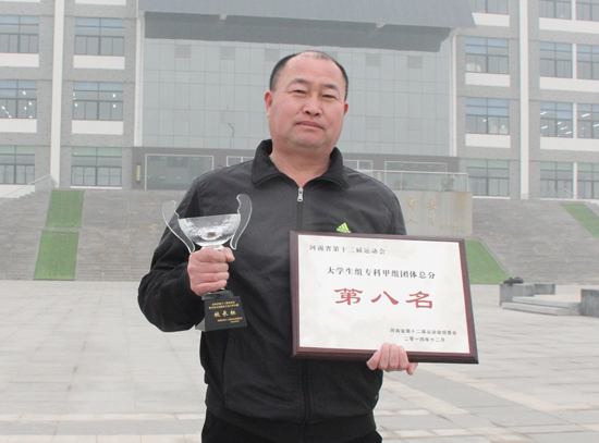 本站讯 1月9日至11日,2015年河南省学生体育总会高校体协分会年会在河南省工程学院举行。全省105所高校200余人参加了此次会议。会上对在2014年河南省第十二届运动会大学生组比赛中取得好成绩的单位进行颁奖。我校在全省高校中,团体总分名列第十,获得河南省第十二届运动会暨首届全民健身大会大学生组“校长杯”,这是对我校高度重视体育工作的有力肯定。我校同时在大中专甲组中团体总分名列第八,受到大会表彰。