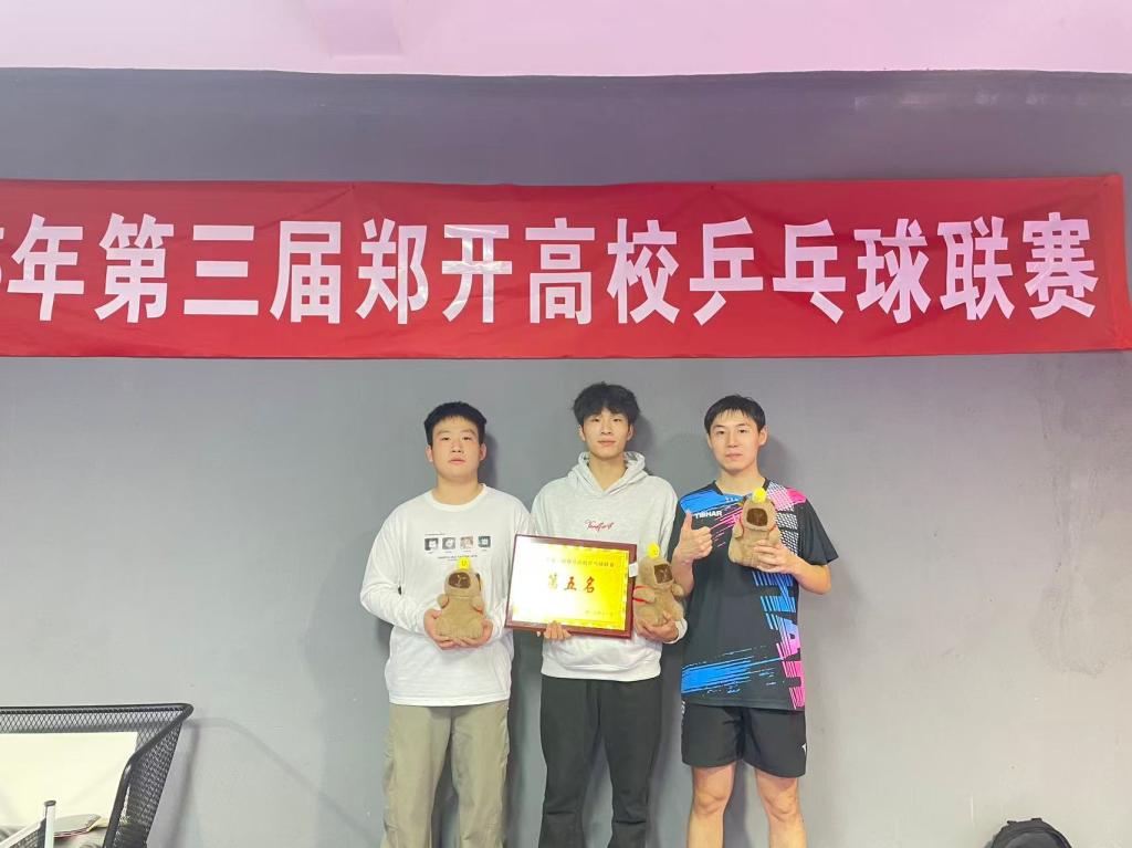 2025年11月1日,在体育部指导教师郭成刚带领下,我校乒乓球社优秀队员参加了郑开乒乓球联赛,队员们奋勇拼搏,不畏困难,最终获得了团体第五的优异成绩,并获得了最佳组织奖。