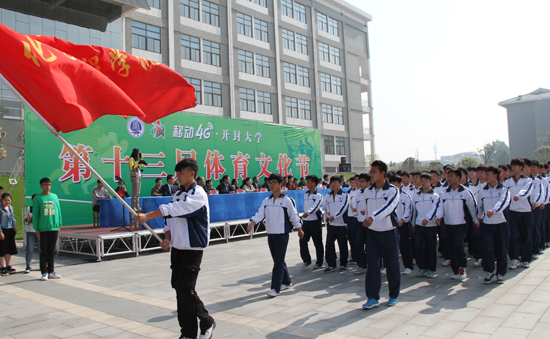 在庄严热烈的运动员进行曲中,13个院部方阵依次入场,他们精神饱满,意气风发,展现了开大人锐意进取、奋发向上的精神风貌。