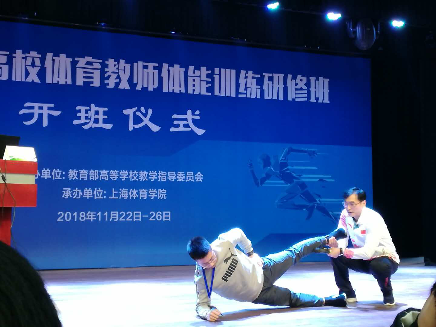 由教育部高等学校教学指导委员会主办,上海体育学院承办,体育教育训练学院具体组织的“首届全国高校体育教师体能训练研修班”,2018年11月22日至26日在上海体育学院举办。本届研修班是为深入贯彻落实总书记在全国教育大会的讲话精神下,强化运用体能训练手段提升大学生体质健康水平,增强高校体育教师体能训练的教育教学能力,邀请了国家体育总局袁守龙教授、闫琪研究员,北京体育大学周爱国教授、李春雷教授,首都体育学院尹军教授、江苏体科所袁鹏博士,上海体育学院高炳宏教授、黎涌明教授、王雪强博士、赵可伟博士等国内体能训练领域的顶级专家为来自全国31省份自治区近200所高职高专以及综合类大学的230名全国高校教师呈现了一场体能训练的视听盛宴。