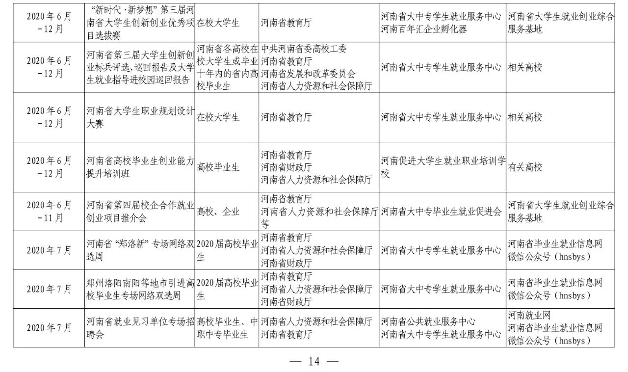 为落实教育部等六部门2020届普通高校毕业生就业“百日冲刺”行动,最大限度降低新冠肺炎疫情对高校毕业生就业的影响,省教育厅、省发展和改革委员会、省工业和信息化厅、省财政厅、省人力资源和社会保障厅、省文化和旅游厅、省退役军人事务厅、省人民政府国有资产监督管理委员会、省军区动员局、共青团河南省委员会、省妇女联合会、省残疾人联合会、省工商业联合会、国家开发银行河南省分行14部门于近日联合下文,共同实施“河南省2020年高校毕业生‘新时代·新梦想’就业创业公益帮扶行动”。