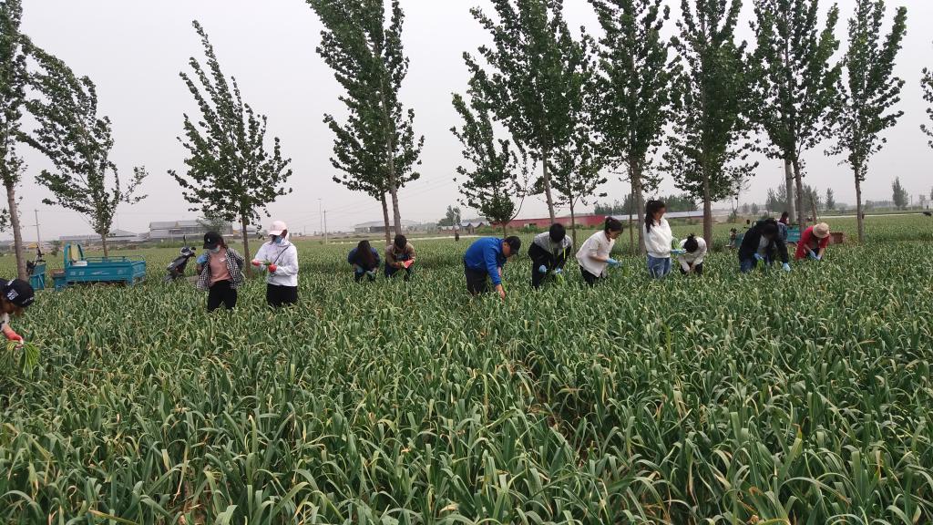 5月1日上午,外国语学院团总支书记肖丽敏带领学院20名青年志愿者到祥符区西姜寨乡帮助劳动力少的农户抽蒜薹。