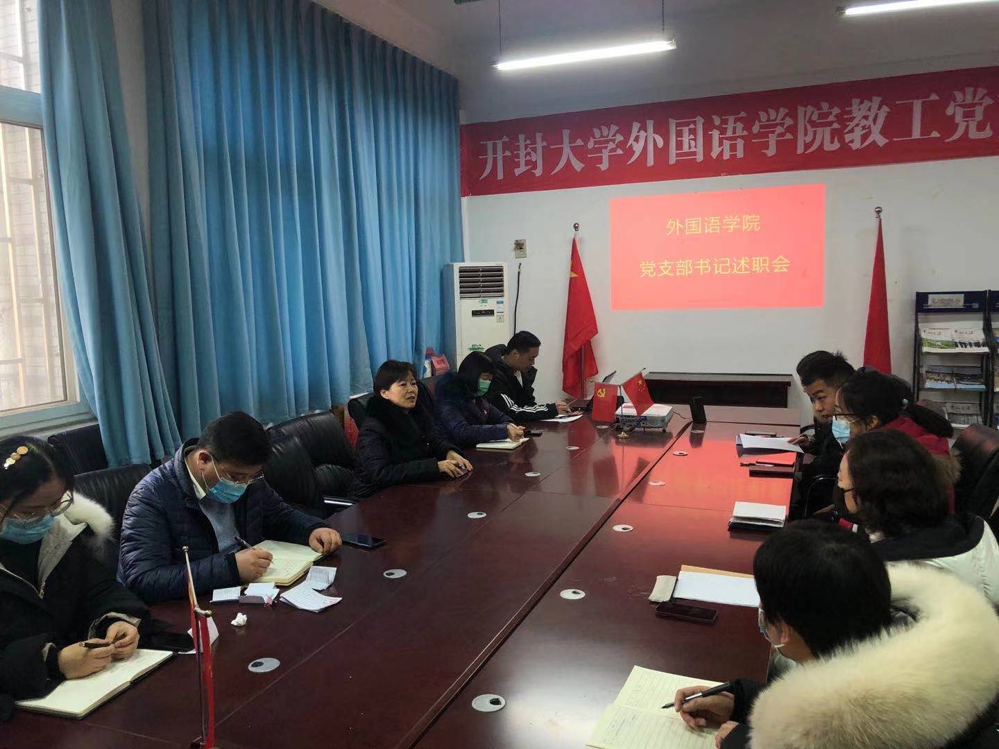 1月7日下午,外国语学院党总支召开2020年度党支部书记述职会。会议由外国语学院党总支书记孟祥茹主持,外国语学院党总支委员、教工党支部委员和学生党支部委员参会。