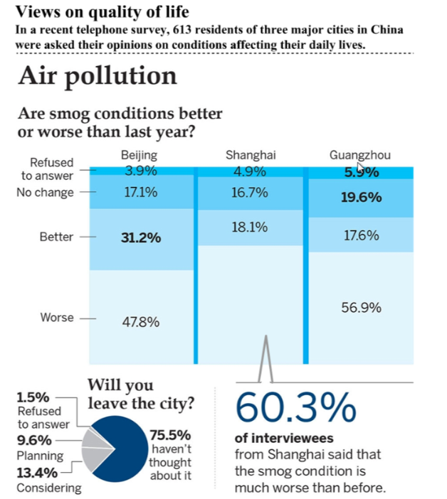 Task: You are required to describe the following charts, giving your account of the survey result and offering your suggestions about what should be done to eliminate or reduce air pollution in big cities.