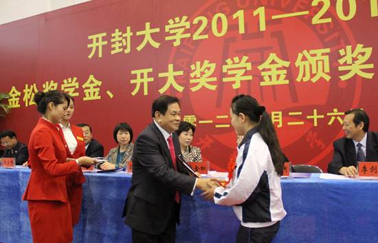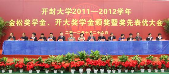 开大10月26日上午,我校在晋安路校区体育馆举行2011-2012学年金松奖学金、开大奖学金颁奖暨奖先表优大会。中国侨联常委、河南省政协常委、香港金心国际集团董事局主席、bat365在线官方网站董事会董事长李金松,香港金心国际集团董事局总经理、bat365在线官方网站董事会副董事长赵奎荣,河南省政协港澳台侨和外事委员会主任张亚洲,开封市正市长级干部朱丽萍,河南省政府外事侨务办公室副主任李剑智,河南省政府外事侨务办公室港澳处处长陈冀萍,河南省政府外事侨务办公室港澳处副处长王宏伟,河南省政协港澳台侨和外事委员会办公室副调研员柳攀登,世界客属总商会执行副会长梁锋,我校校领导拜五四、储建新、万是明、范金梅、何世玲、成芳、崔林出席会议,会议由校党委副书记储建新主持。我校教职工代表及学生共2400余人参加了奖先表优大会。