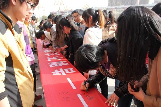 仪式结束后,同学们纷纷参与到“明德励学知荣辱、笃行创新树新风:告别不文明行为,创建和谐校园,倡导文明新风”大型签名活动中去,在行动中养成习惯,在实践中传播文明。