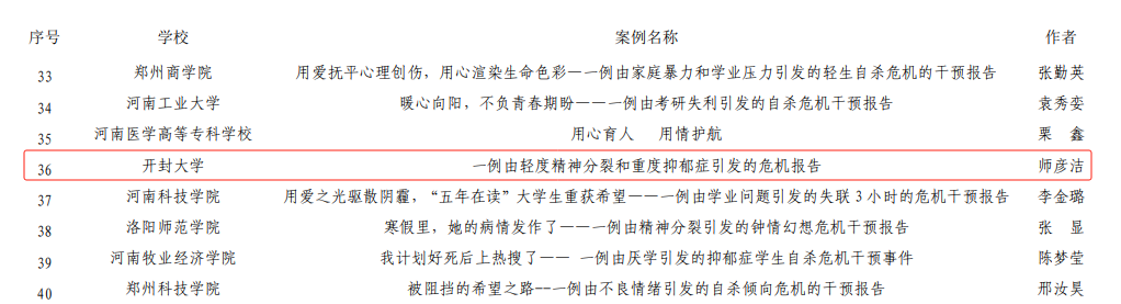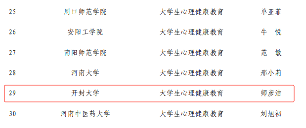 其中,师彦洁老师申报的《大学生心理健康教育》获评河南省大学生心理健康教育优秀课程;吴丽娜老师和师彦洁老师申报的大学生心理危机干预案例获评优秀案例。