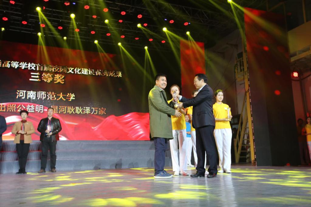 11月27日至28日,河南省首届普通高等学校校园文化建设优秀成果展演活动(校园文化舞台展演、校园文化成果展示)在河南大学隆重举行。省委高校工委专职副书记、省教育厅党组副书记郑邦山、省教育厅副巡视员李金川、省教育厅学生处处长王继东等领导出席展演活动,并为获奖单位颁奖。