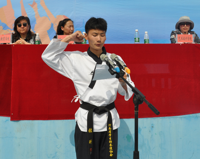 体育教研部教师牛文娜、2016年和2017年中国大学生跆拳道锦标赛品势冠军张昕同学分别代表全体参赛裁判员、运动员宣誓。