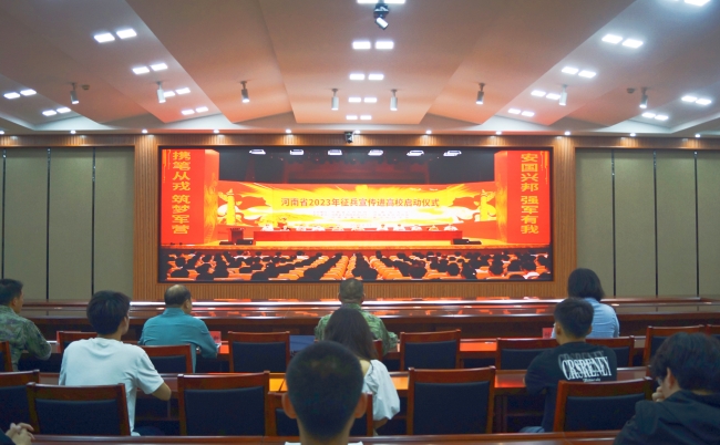 本站讯 6月13日上午,河南省人民政府、河南省军区组织河南省2023年征兵宣传进高校启动仪式。我校在行政楼第二会议厅设分会场,龙亭区人武部上校部长张舰、校党委副书记储建新出席会议,龙亭区人武部、校学生工作部(武装部)相关同志及各院部师生代表集中收看了本次启动仪式的实况直播。