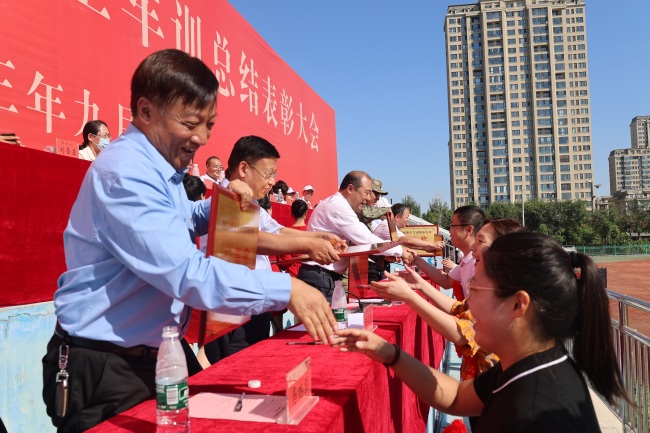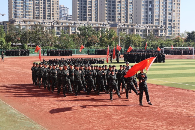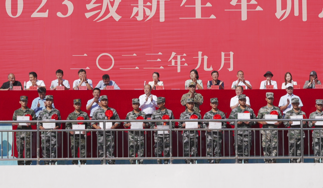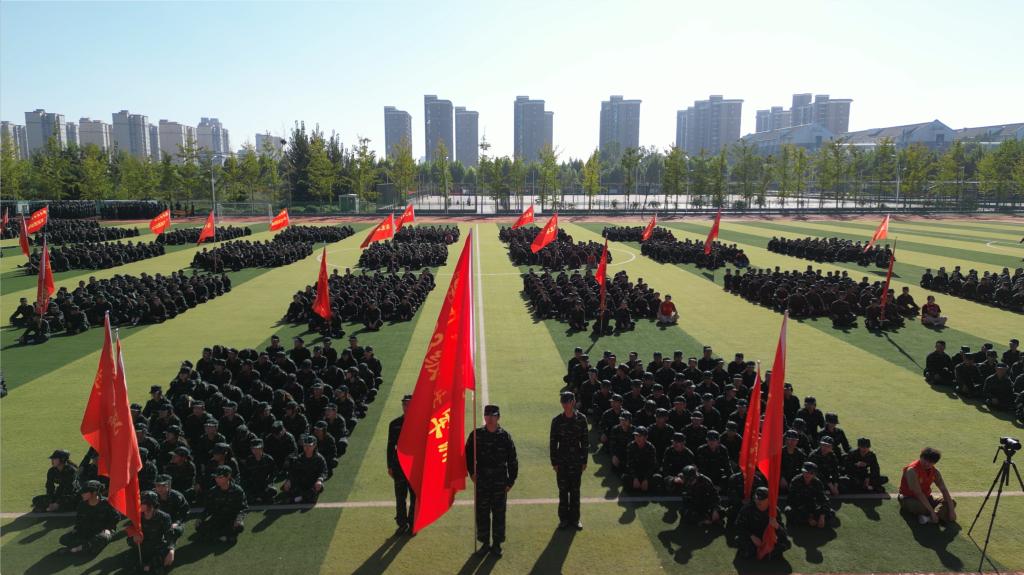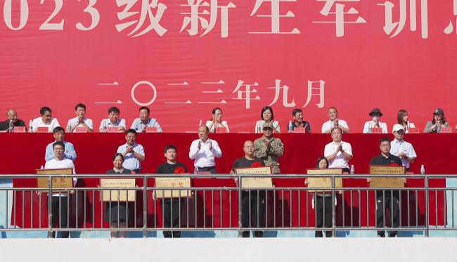本站讯 9月22日,我校2023级新生军训总结表彰大会在体育场举行。校领导储建新、万是明、曾小平、谢文忠、马林强,开封市龙亭区人民武装部中校副部长王千里出席大会,军训工作领导小组成员,各院部党总支书记、院长及4700余名新生参加大会。大会由副校长万是明主持。
