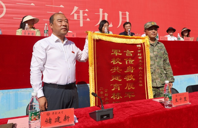 汇报表演结束后,在雄壮嘹亮的国歌声中,全体人员庄严肃立。随后,储建新代表学校向龙亭区武装部赠送锦旗,表达了崇高的敬意和感激之情。