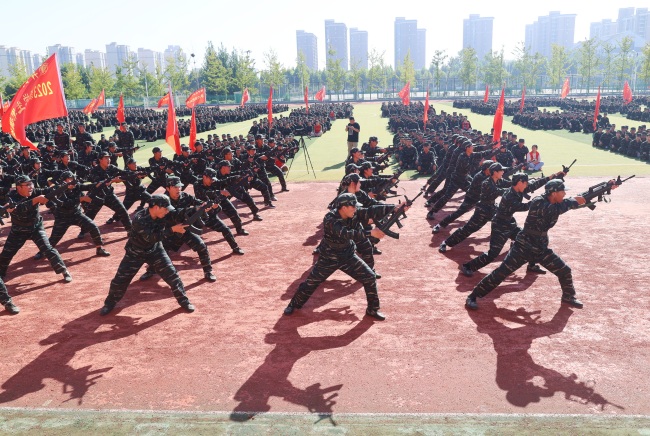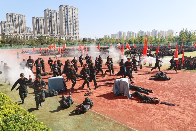 由材料与化学工程学院组建的刺杀操方阵、电子电气工程学院组建的捕俘拳方阵、机械与汽车工程学院组建的匕首操方阵、医学部组建的战术医疗方阵分别进行了特色方阵汇报表演。一招一式磅礴震撼,每一声口号掷地有声,战鼓擂响,硝烟弥漫,赢得了现场观众阵阵掌声和欢呼声。