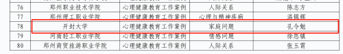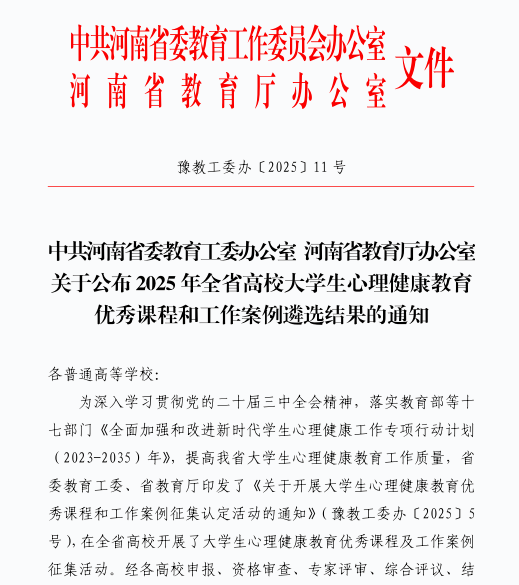 本站讯 近日,河南省委教育工委、河南省教育厅发布《关于公布2025年全省高校大学生心理健康教育优秀课程和工作案例遴选结果的通知》(豫教工委办〔2025〕11 号)。我校孔令勉老师申报的《心理健康教育工作案例》,获评“河南省高校心理健康教育工作优秀案例”。