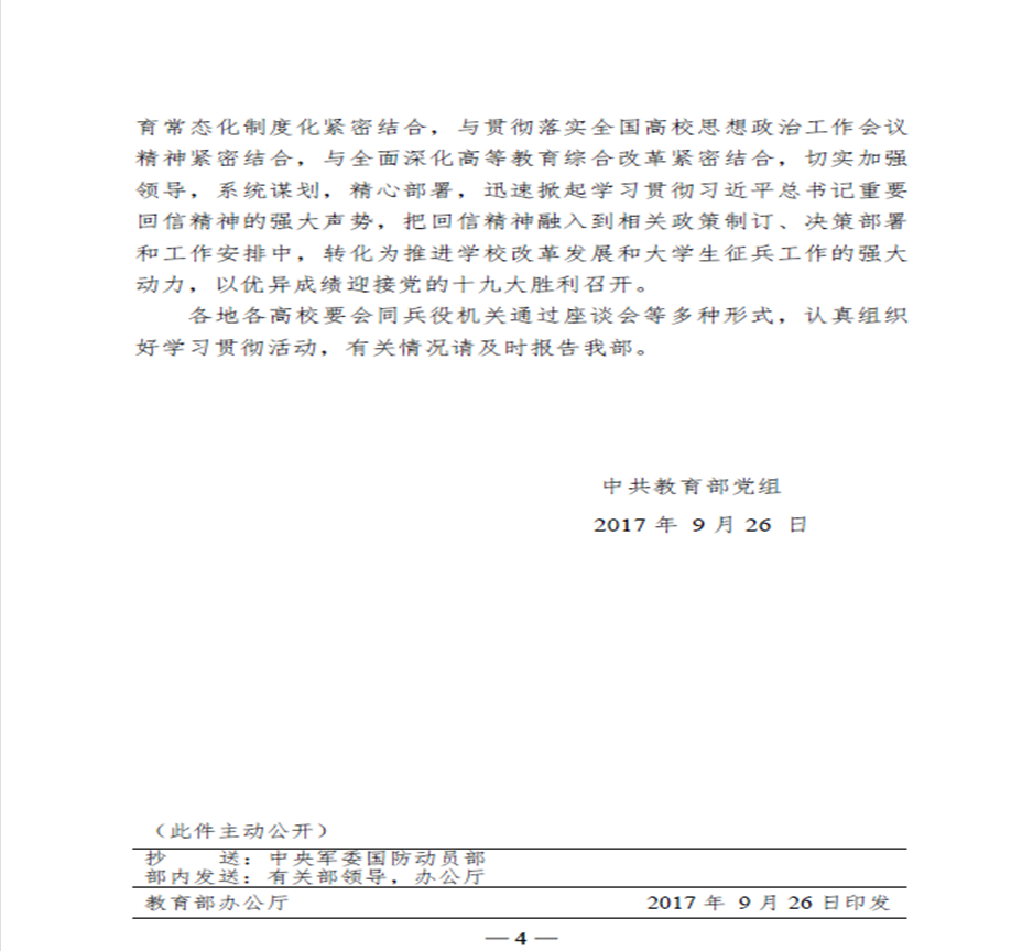 中共教育部党组关于学习贯彻习近平总书记给南开大学新入伍大学生重要回信精神的通知