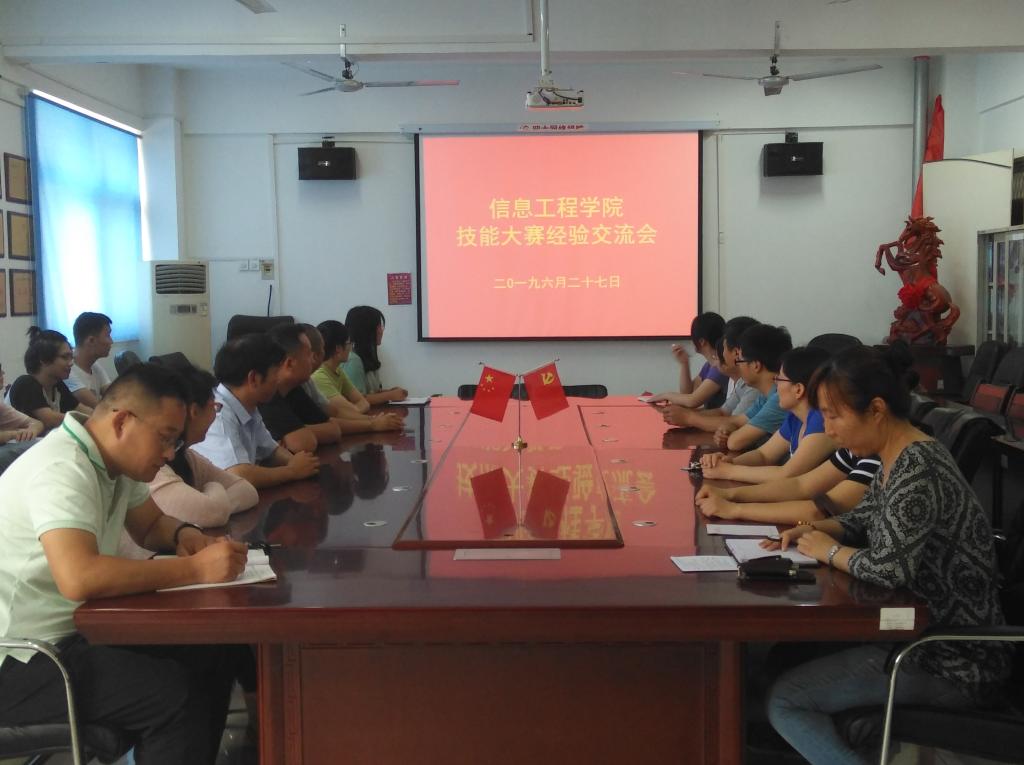 本站讯 6月27日,为了进一步总结技能大赛经验,提升技能大赛参赛成绩,信息工程学院在院会议室召开了技能大赛经验交流会.学院副院长张才千、李响,党总支副书记高剑南及相关技能大赛指导教师和参赛学生参加了会议。