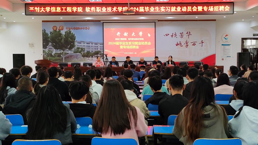 为深入贯彻党的二十大精神,落实党中央、国务院“高质量充分就业,强化就业优先”的决策部署,11月4日,信息工程学院、软件职业技术学院在8号楼报告厅召开2024届毕业生实习就业动员大会暨专场招聘会。学校就业与校企合作处副处长王亚辉、信息工程学院党总支书记袁震、院长张新成、副院长李响、王晓婷及各教研室主任、辅导员老师和764名毕业生参加此次会议,党总支副书记李红礼主持会议。大会采用线上线下相结合的方式,设置了一个主会场,两个分会场。