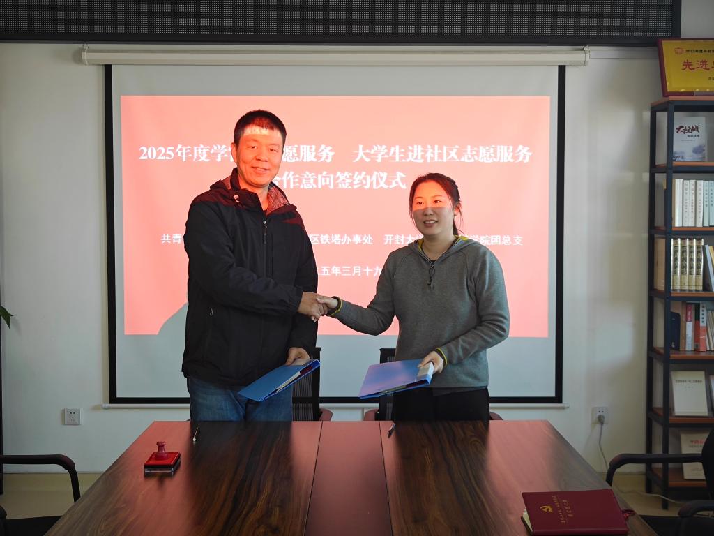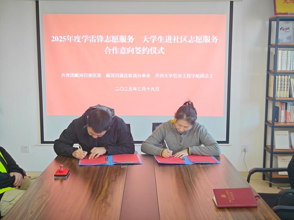 团顺河回族区委书记王飞、铁塔办事处组宣统委员张蕊;信息工程学院团总支书记贺钰、辅导员高俊笑及10余名“小青桔”青年志愿者代表参加了签约仪式。仪式上,学院分别与团顺河回族区委和铁塔办事处签订了2025年度的工作合作意向。王飞就今后如何加强共青团组织对大学生就业指导工作提出了建议,张蕊就大学生志愿者如何更好地在基层工作中接受锻炼给出了指导意见。