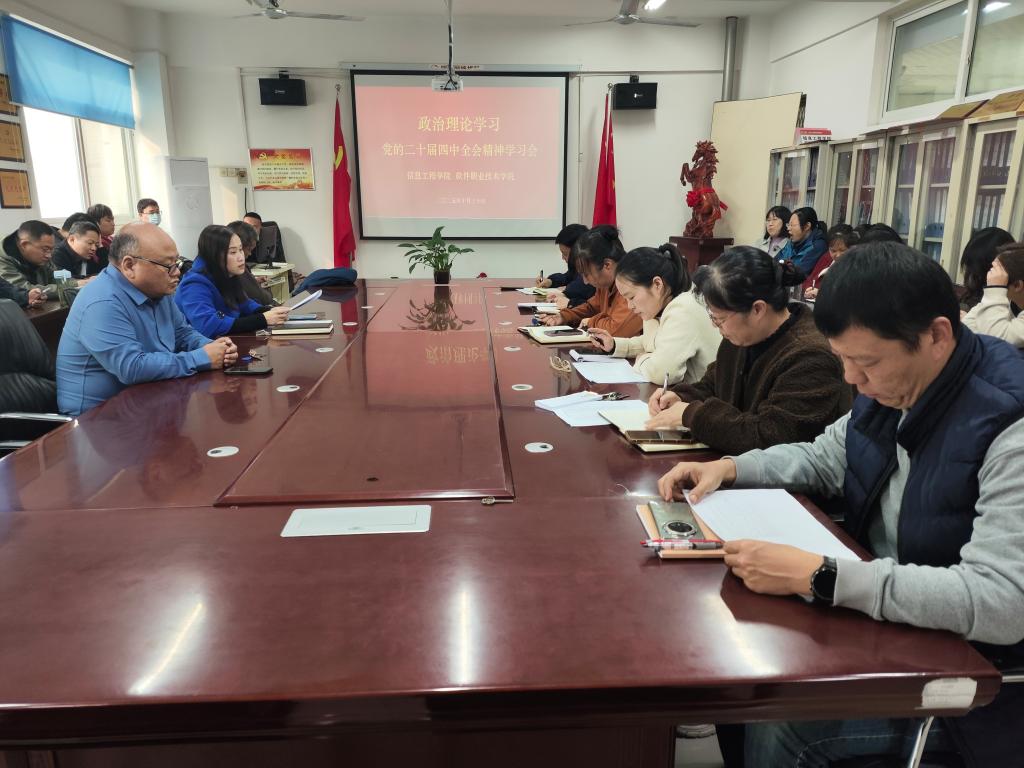 本站讯 10月30日下午,信息工程学院在三楼会议室组织全体教师集中学习党的二十届四中全会精神。会议由党总支书记武莹主持。