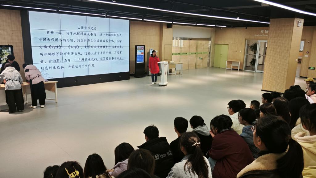 活动特别邀请顺河回族区非物质文化遗产“古籍修复技艺”传承人佟燕华授课。佟老师以《典籍薪传 古技今渐——古籍修复技艺的文化传承》为题,主要讲解古籍、古籍修复概念,古籍装帧之美,古籍修复案例等内容,通过图片演示、现场操作展示以及实践互动体验,演示雕版印刷、碑石传拓等技艺,为大家提供了一堂生动有趣的古籍修复课,让文化遗产保护从抽象的理论说教转化为生动的沉浸式体验。