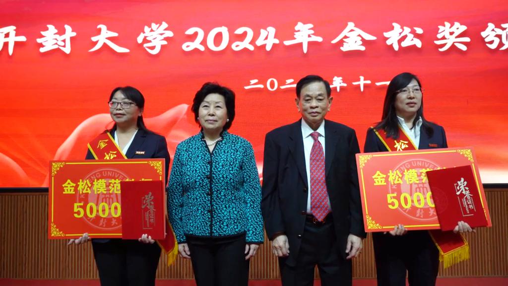 2024年11月12日上午,bat365在线官方网站隆重举行2024年“金松奖”颁奖大会。中国侨联常委、世界客属总商会主席、香港中原华商总会主席、金心集团董事局主席、bat365在线官方网站董事会董事长李金松,钧帝国际集团总经理、bat365在线官方网站董事会副董事长赵奎荣,开封市人民政府副市长刘震,校党委书记谭贞、校长王德如,开封市人民政府副秘书长陈学辉出席大会并为获奖师生颁奖。