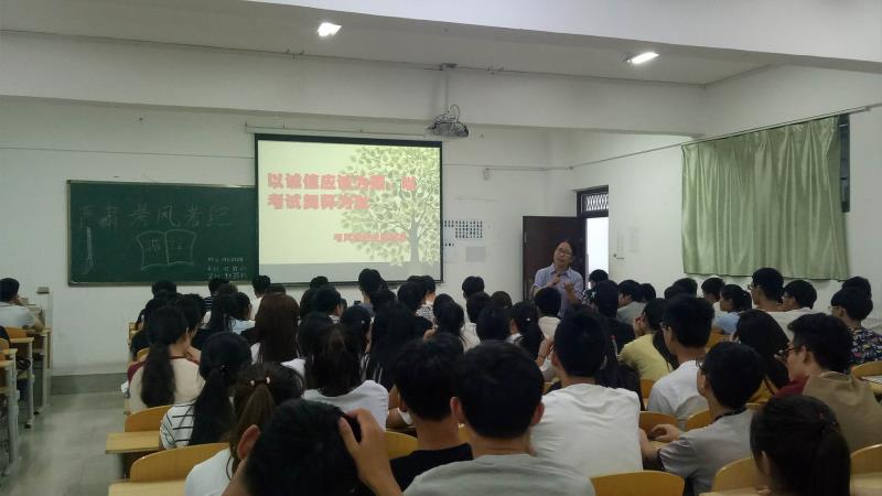 本站讯 期末将近,为营造良好考试氛围,同时在暑假假期即将来临时对学生进行必要的安全教育,17级全体学生于6月21日晚在401、402、404教室召开了考风考纪暨假期安全教育主题班会,会议由辅导员张娜娜老师主持。