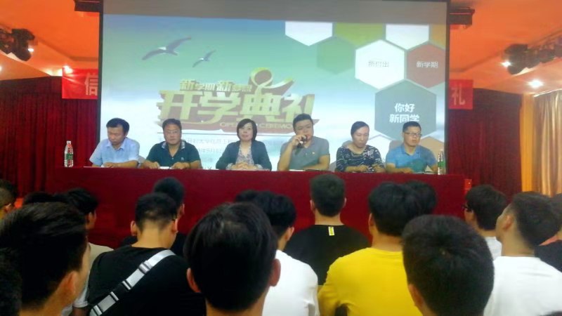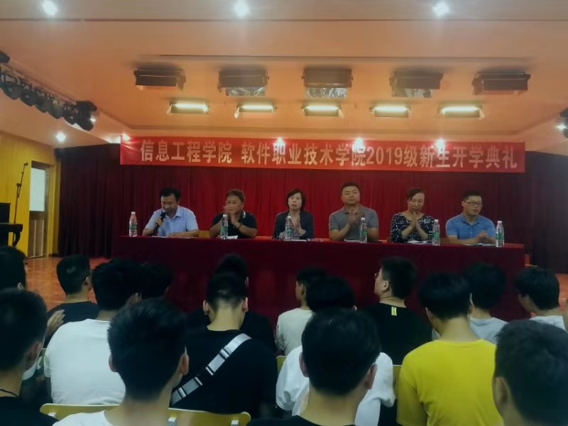 本站讯 9月8日下午,信息工程学院、软件职业技术学院在16号楼报告厅举行2019级新生开学典礼暨军训动员大会。学院党总支书记袁震、院长杨桦、胡增顺教授、副院长李响、张才千出席了典礼。学院全体辅导员老师、2019级600余名新生参加了典礼。典礼由学院党总支副书记高剑南主持。