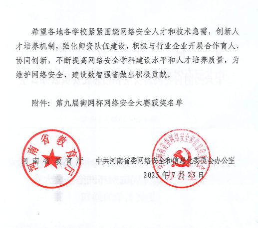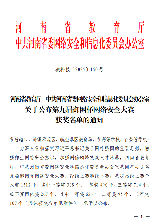 本站讯 近日,河南省教育厅、中共河南省委网络安全和信息化委员会办公室联合发布《河南省教育厅 中共河南省委网络安全和信息化委员会办公室关于公布第九届御网杯网络安全大赛获奖名单的通知》,我校共斩获一等奖1项、二等奖2项、三等奖7项。