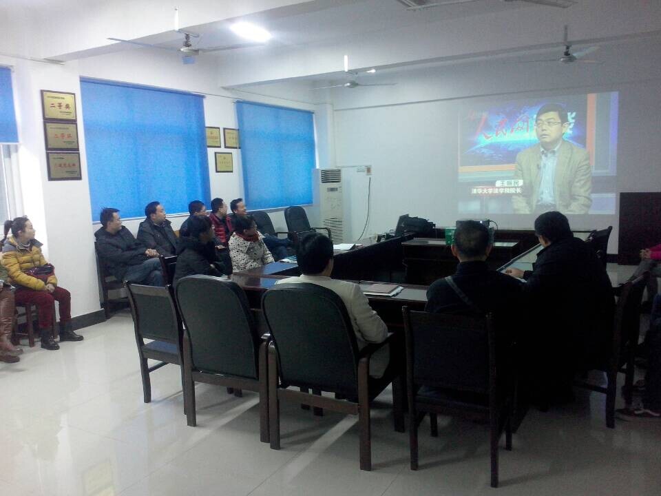 11月24日下午,我院全体教师党员和部分学生党员在院会议室一起观看了“党的十八届四中全会公报亮点解读”的视频,来自清华大学法学院院长王振民,中央党校党建部副主任张志明,国家行政学院教授汪玉凯做客人民网强国论坛,以“党的十八届四中全会公报亮点解读”为主题与网友在线交流。