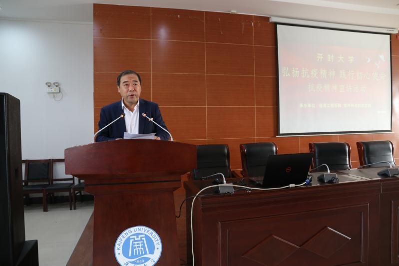 本站讯 10月29日下午,由学工部主办,信息工程学院、软件职业技术学院承办的“弘扬抗疫精神 践行初心使命”抗疫精神报告会在土木六楼会议厅举行。河南大学淮河医院事业发展部副主任李国杰、盖颖;河南省呼吸与危重症学会呼吸治疗分会青年委员、开封市重症医学会委员、河南首批援鄂医疗队队员、河南大学淮河医院主治医师戚冠斌;校党委副书记储建新,党委委员、组织统战部部长赵海胜,学生工作部部长孙勇出席了宣讲活动。各院部师生代表参加了宣讲活动。