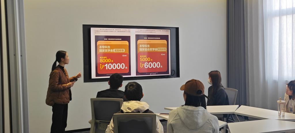 高俊笑首先介绍了本次活动主题和意义,是为了让学生正确认识国家奖助学金、助学贷款的意义,更好理解国家资助政策,引导大家常怀感恩之心,不铺张浪费,热心公益,切勿因家庭困难产生自卑心理,而是立志砥砺前行,提高综合素质,争取有理想、敢担当、能吃苦、肯奋斗的时代新人。随后通过详细介绍“奖、助、贷、勤、免、补、减”全方位资助体系,帮助同学们掌握各项资助体系的申请条件、流程和注意事项等。最后以一系列的资助成效案例使同学们直观地感受到资助政策的温暖,激发其成长动力,实现自我价值。