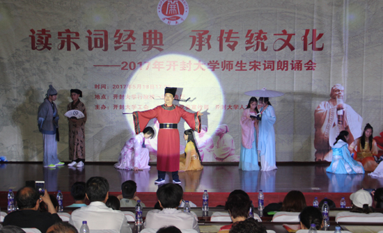 本站讯 5月18日,我校在行政楼一楼报告厅举行了“读宋词经典、承传统文化”大型师生宋词朗诵会。此次活动由我校工会、党委宣传部、人文学院共同举办。开封市总工会副主席戴国胜、开封市总工会文教卫工会主任李汴军、河南工会日报开封记者站站长刘长征,我校校领导储建新、成芳、李治出席了朗诵会,校党委宣传部、人文学院、学报编辑部和各分工会负责人以及师生代表参加了朗诵会。