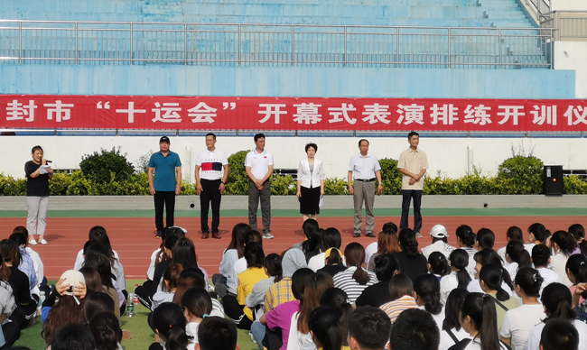 开封市教体局副局长王自松对我校的前期准备工作表示了充分的肯定,对所有参训的学生与提供保障的老师们表示衷心的感谢。王局长向同学们说明了本次运动会的重大意义,这次运动会正值新中国成立70周年,开封市运动会第40个年头,市委、市政府高度重视,要以此次运动会向祖国70华诞献礼。他希望同学们在这次运动会开幕式上充分展示个人风采,为十运会描绘出一幅开封人民发展体育运动、增强人民体质的壮丽画卷。
