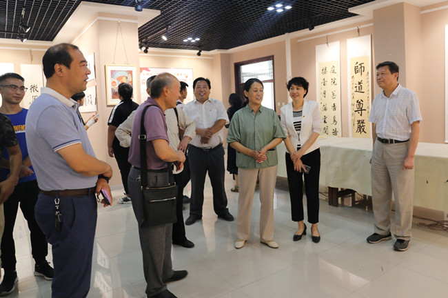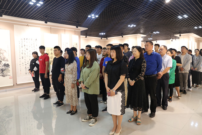 本站讯 为隆重庆祝新中国成立70周年, 9月29日上午,由我校工会主办、校书画协会协办、艺术设计学院承办的“不忘初心,牢记使命”主题教育书画展开幕式在艺术设计学院二楼东展厅举行。开封市金明书画院姬义海院长、黄河水利职业技术学院宗致远教授,校领导陈灿、宋志敏、储建新、赵辉、成芳、李治、马林强出席了开幕式,党委组织统战部、校工会、艺术设计学院负责人参加并观看了画展。