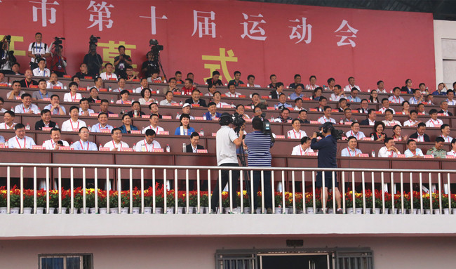 本站讯 9月26日上午,开封市第十届运动会在开封市华北体育场盛大开幕,这是我市在迎接中华人民共和国成立70周年之际举办的一次综合性体育盛会。我校党委书记陈灿,校长宋志敏,党委副书记储建新,工会主席成芳出席开幕式,校团委、体育部、机械与汽车工程学院、财政经济学院、医学部、国际教育学院部门教师参加。我校近千名学生承担“十运会”开幕式迎宾礼仪、花束队、彩旗队、引导员、志愿服务以及大型文体表演《开封你好》第一场《活力开封》和第四场《我和祖国》的演出任务。