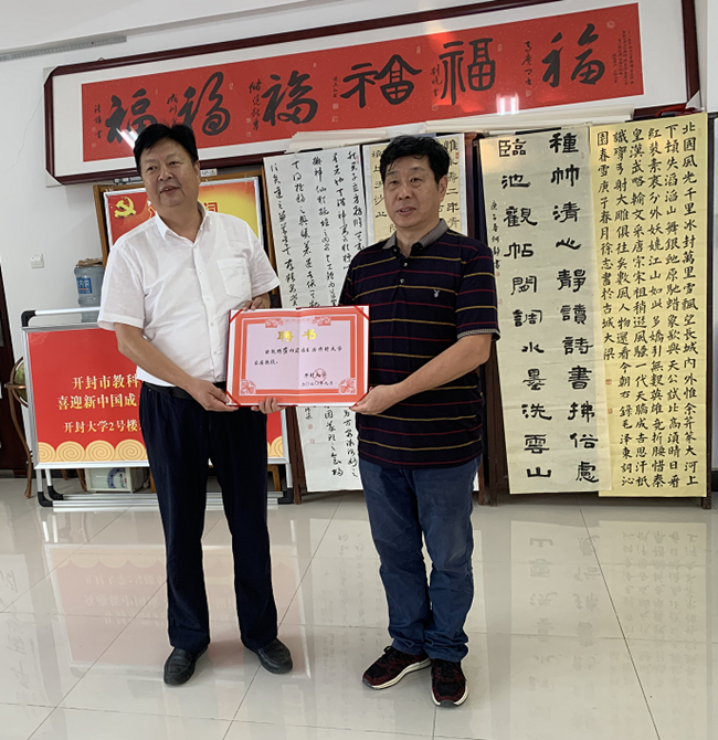 本站讯 9月16日下午,开封市文联秘书长郭张开,开封市书法家协会副主席郭思源,中国书法家协会会员、甲骨文钧瓷龟甲片创始人傅伟华,中国书法家协会会员、中国文艺家艺术研究院院士崔向前一行莅校调研指导文化建设工作。我校校长宋志敏,校工会、艺术设计学院相关负责人及工作人员陪同调研。