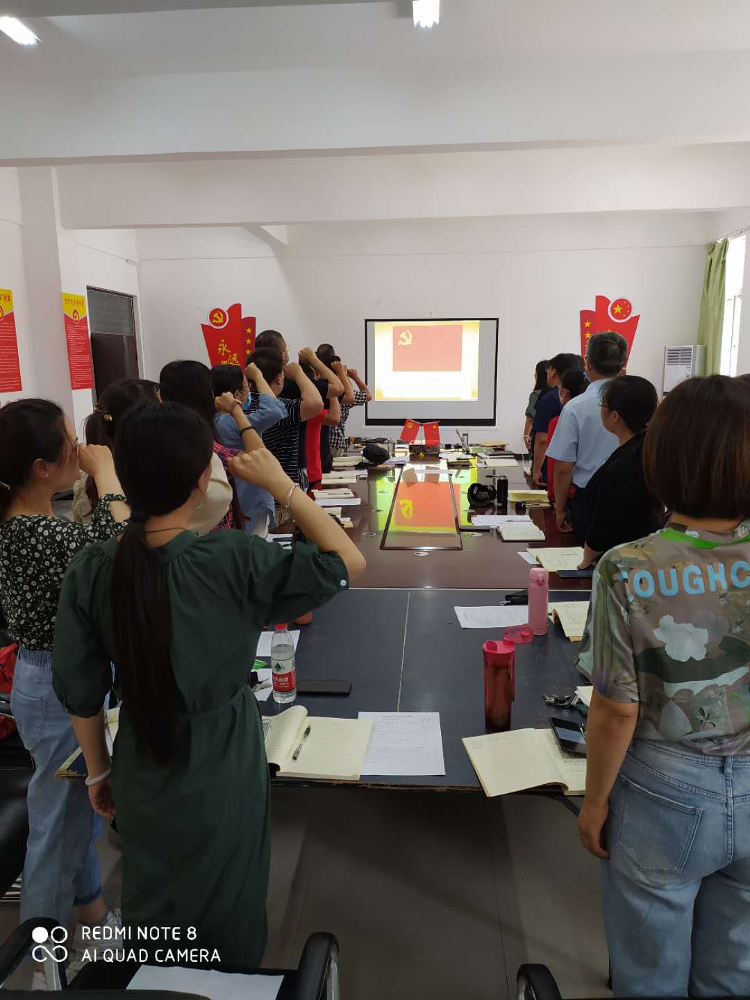 首先重温入党誓词,全体党员面向党旗,由苗靖同志带领全体党员重温入党誓词;第二,诵读经典,由王赪同志带领大家学习了《习近平2020年两会讲话精髓》;第三,过集体政治生日,当月过政治生日党员苏园园、苗靖、石淼、韩冰、孙利敏、王赪、李静、郭梦聪八位老师纷纷谈了政治生日感言。校纪委书记马林强同志对八位党员教师送出了政治生日寄语;第四,全体党员交纳了本月党费。最后,教工支部书记对通报了上月党员积分情况。