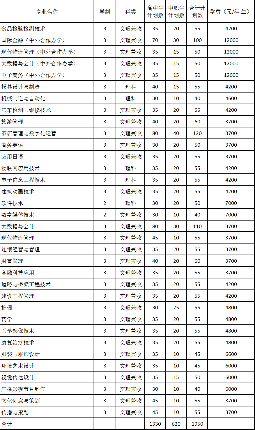 根据考生文化素质、职业技能测试成绩的总分(中职生总分按照计算后执行),按普通高招考生和中职毕业生考生分开划定最低录取控制分数线,按所报志愿分专业从高分到低分依次录取。同分的考生按文化素质、职业技能(职业适应性测试)、语文、数学、英语的考试成绩进行依次排序录取。根据我校生源情况,可调整招生计划。