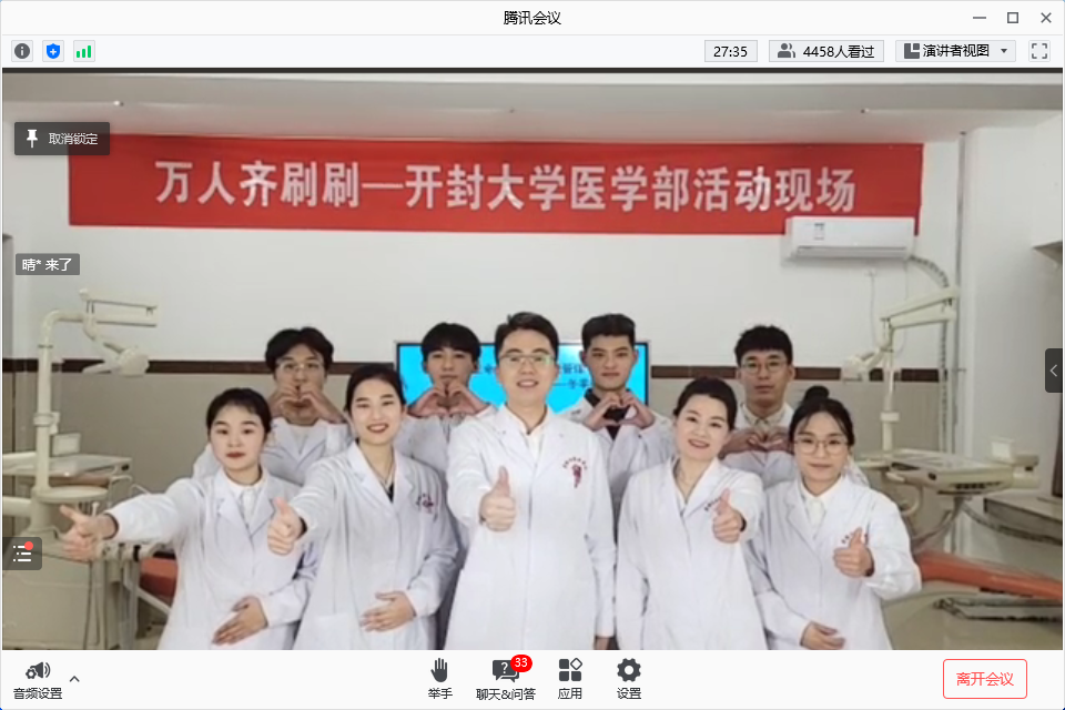 1110日下午,由河南省老年口腔医学继续教育培训中心主办、省内多所本专科高校(口腔)医学院(系)协办的“万人在线齐刷刷”活动第二期在“腾讯会议”召开。我校1名教师和8名学生组建了科普团队,在医学部口腔系马惠萍、马冬梅、杨玉红、王艳莉袁浩口腔实中心李凯、宗盈盈教师的指导下,经过四天的紧急演练,在线奉献了精彩的口腔知识科普情景剧。