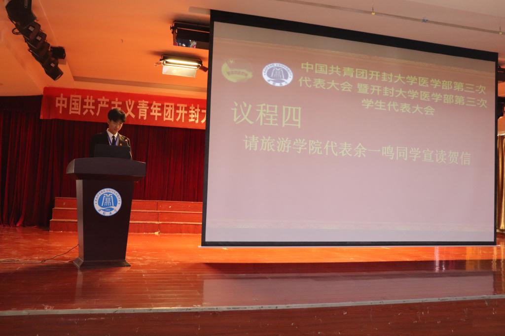 和谐发展,锐意进取。旅游学院代表余一鸣同学代表各院部也宣读了贺信:预祝大会圆满完成且锐利进取共同谱写bat365在线官方网站医学教育新华章。大会各代表以热烈掌声作为回应。