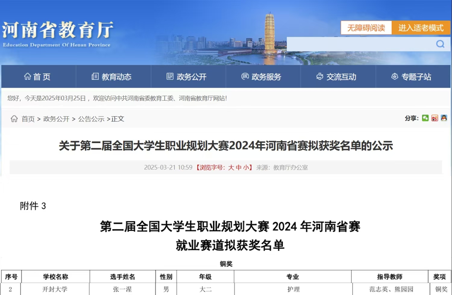 筑梦青春志在四方,规划启航职引未来。本次大赛由河南省教育厅主办,吸引了全省174所高校146万优秀学子同台竞技。张一湦同学以清晰的职业目标、科学的规划路径及扎实的专业素养,经过初赛、复赛层层选拔,最终在省赛中脱颖而出,充分展现了开大学子昂扬向上的精神风貌和医学院“医道匠心、知行合一”的育人成果。